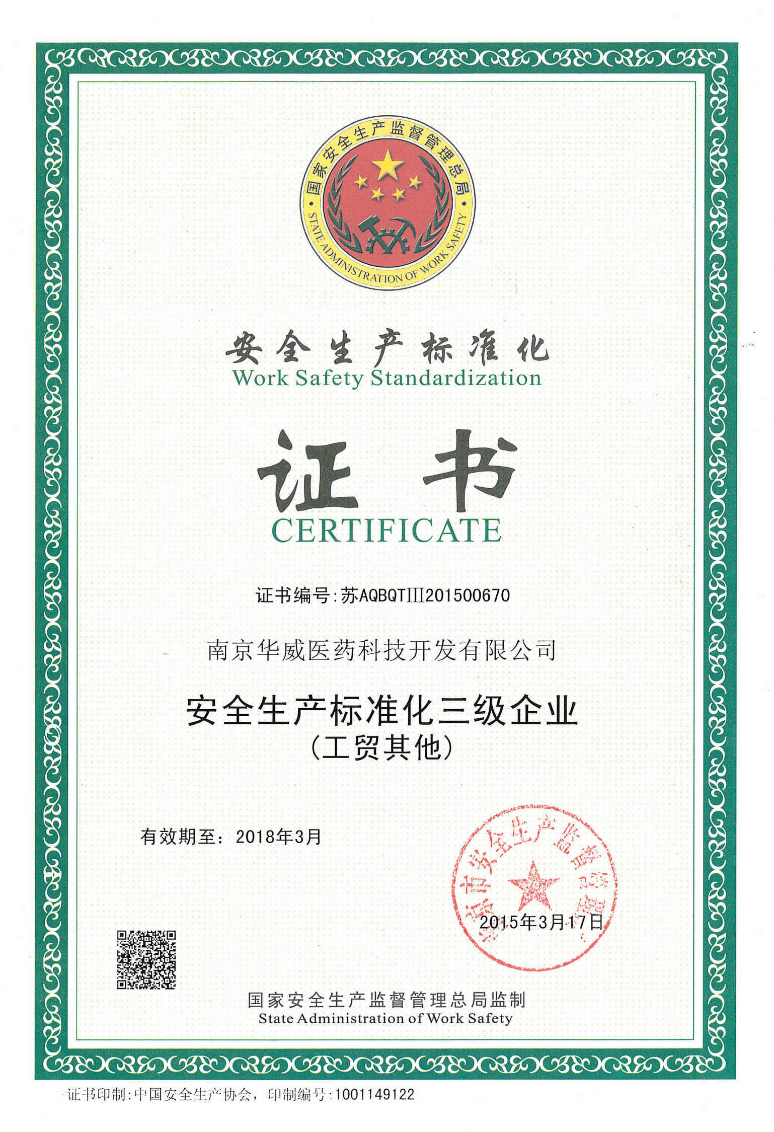 近日,華威醫(yī)藥接獲南京市安全生產(chǎn)監(jiān)督管理局通知,華威醫(yī)藥通過了“冶金等工貿(mào)企業(yè)三級安全生產(chǎn)標(biāo)準(zhǔn)化”達(dá)標(biāo)審查。2014年,根據(jù)國家安全監(jiān)管總局《全國冶金等工貿(mào)企業(yè)安全生產(chǎn)標(biāo)準(zhǔn)化考評辦法》(安監(jiān)總管四〔2011〕84號)、《關(guān)于印發(fā)冶金等工貿(mào)企業(yè)安全生產(chǎn)標(biāo)準(zhǔn)化建設(shè)評審工作管理辦法的通知》(安監(jiān)總管四〔2011〕87號)的有關(guān)規(guī)定和要求,我司通過建立安全生產(chǎn)責(zé)任制,制定安全管理制度和操作規(guī)程,排查治理隱患和監(jiān)控重大危險源,建立預(yù)防機(jī)制,規(guī)范生產(chǎn)行為,使各生產(chǎn)環(huán)節(jié)符合有關(guān)安全生產(chǎn)法律法規(guī)和標(biāo)準(zhǔn)規(guī)范的要求,人、機(jī)、物、環(huán)處于良好的生產(chǎn)狀態(tài),并持續(xù)改進(jìn),不斷加強(qiáng)企業(yè)安全生產(chǎn)規(guī)范化建設(shè)。