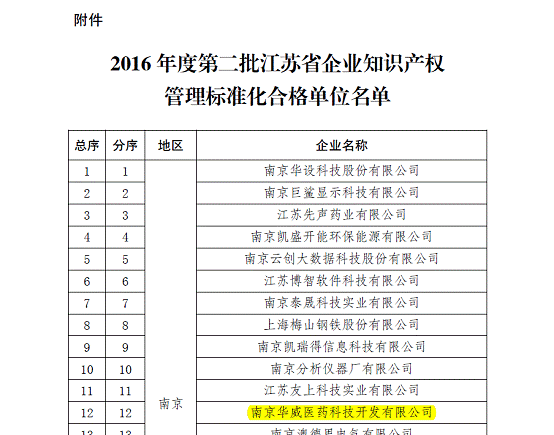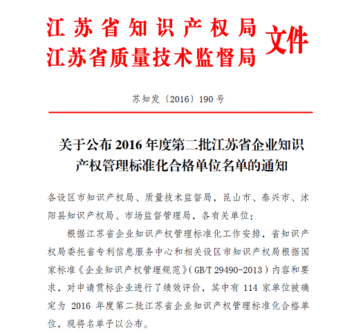 近日,接到蘇知發(fā)〔2016〕190號通知,華威醫(yī)藥順利通過知識產(chǎn)權(quán)管理體系“貫標(biāo)”審核,成功獲批江蘇省知識產(chǎn)權(quán)“貫標(biāo)”合格單位,使得公司知識產(chǎn)權(quán)的風(fēng)險防范與自我保護(hù)多了一重保障,也進(jìn)一步地給廣大客戶的權(quán)益增添了一重保障。