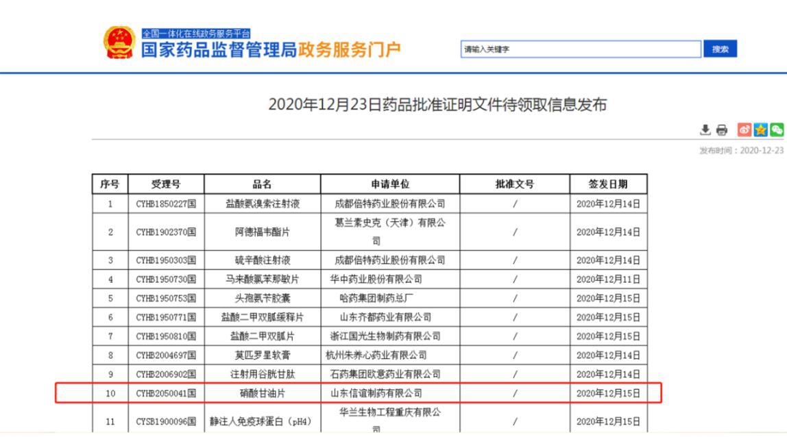 2020年12月23日,國(guó)家藥品監(jiān)督管理局正式發(fā)布通知,華威醫(yī)藥受上藥集團(tuán)山東信誼制藥有限公司委托的硝酸甘油片(0.5mg)項(xiàng)目通過(guò)一致性評(píng)價(jià),這是國(guó)內(nèi)第二家通過(guò)硝酸甘油片一致性評(píng)價(jià)的企業(yè)。